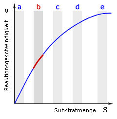 Während im Bereich a eine praktisch lineare Abhängigkeit der Reaktionsgeschwindigkeit v allein von der Substratkonzentration festgestellt werden kann, ist die Reaktionsgeschwindigkeit im Bereich b sowohl von der Substrat- als auch von der Enzymkonzentration abhängig. Es handelt sich hier um eine Reaktion zweiter Ordnung. Ihr Geschwindigkeitsgesetz lautet:
